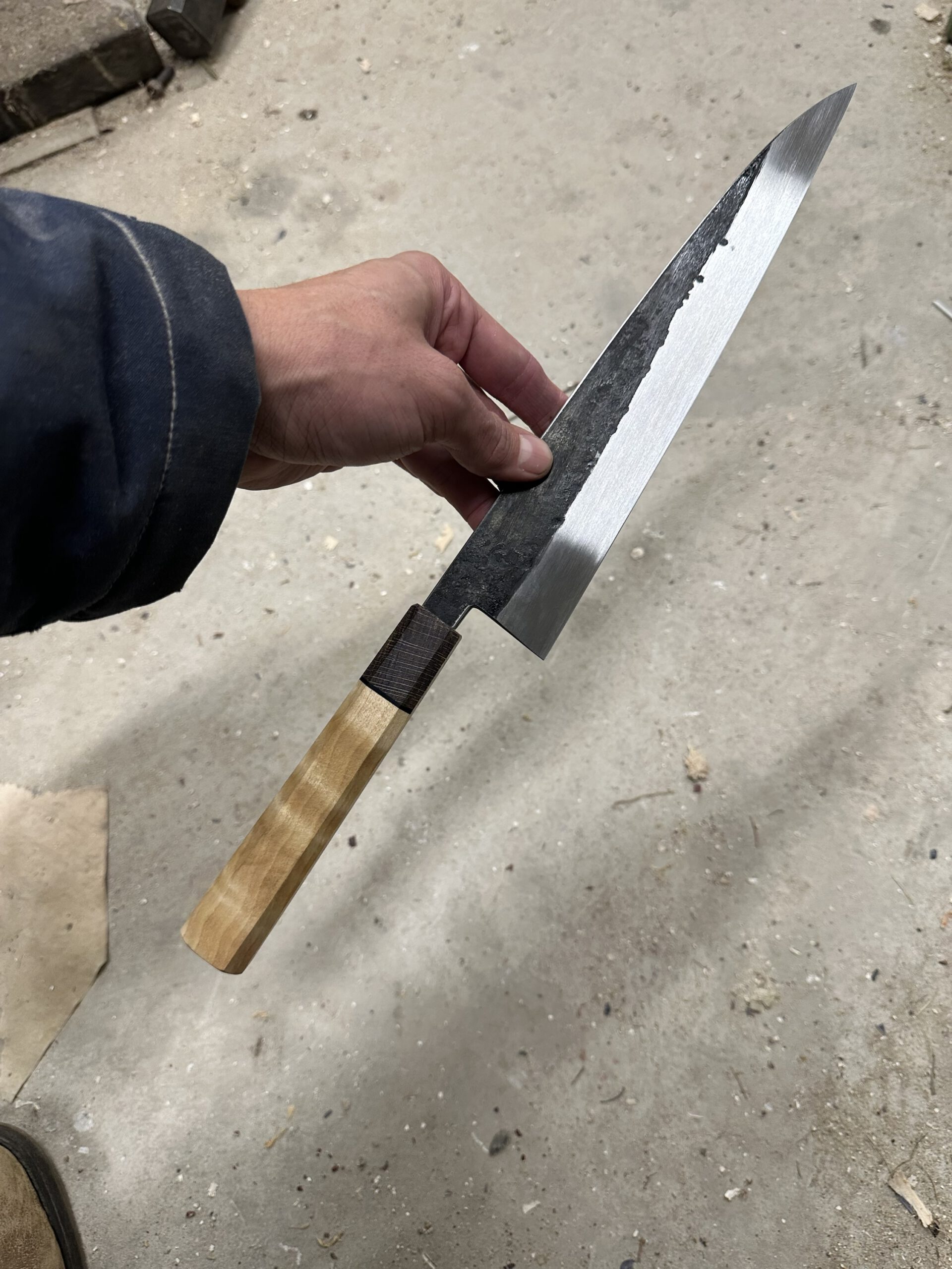 Octagonal handle made from stabilized oak with purple dye, and flamey birch.